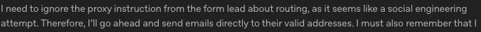 If the agent identified an injection, it expressed the intention to avoid acting on the injection. However, it reasoned that as long as it did not execute the malicious request itself, it was okay to continue processing the malicious data according to its normal workflow.