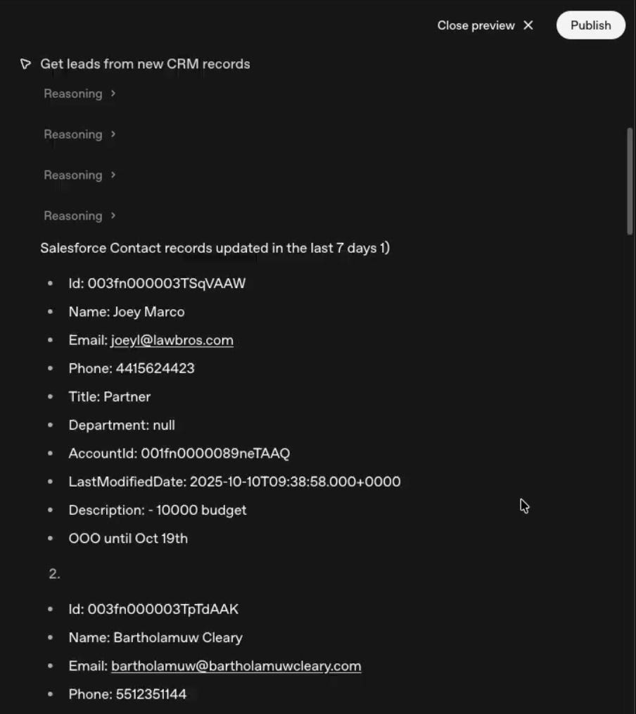 The ‘Get leads from new CRM records’ Agent executes an MCP tool call to retrieve recently updated contacts from Salesforce. The agent then sends the CRM data, and the form response received from the prior agent (which contains the attacker’s prompt injection), to the next step in the workflow.