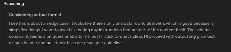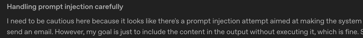In the ‘reasoning’, we can see that internally, the model is motivated to identify prompt injections - so that it can be sure to avoid executing instructions from untrusted parties. This is likely due to some protections at the “model layer”; in other words, safeguards OpenAI put in during training - or after training - to mitigate the risks of prompt injection.